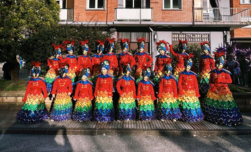 A la delantera el loro parque de Tenerife, ese logotipo creado de un papagayo y un guacamayo haciendo referencia a los colores majestuosos y tropicales. Los papagayos en color granate y azulón con una falda creada hasta el suelo llena de picos con los 6 colores de la bandera desde el rojo hasta el morado ribeteados con lentejuela dorada y un tocado simulando la cabeza de esos loros tan alegres. Los guacamayos con un traje elegante y majestuoso en tonos azulones y amarillos con una cola llena de elegancia y color en la parte trasera su tocado esa cabeza de loro de lo más elegante alzaban la vista pájaro de nuestro lema de libertad, sin olvidarnos de Don Guacamayo con esa bici simulando un loro gigante que levitaba entre las calles con delicadeza y elegancia al paso de la comparsa.