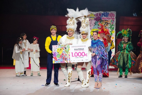 Nuestra alegría llega en Illumbe cuando nos otorgan el 1ºpremio a mejor diseño de vestuario y en la cena de entrega de premios por 4 año consecutivo y 8· año en nuestro trayectoria con el GRAN PREMIO AL CARNAVAL DONOSTIARRA. Un año más volvemos a subirnos a la nube del reconocimiento y la valoración a la creatividad y la imaginación.