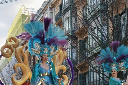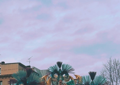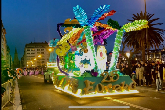 Llega el día, todos los comparseros con sus trajes, carroza espectacular con sus tres reinas y el coro, todos con ganas de enseñar a la ciudad lo que desde meses atrás llevábamos preparando. Pero una tremenda lluvia invadió las calles dejando a los comparseros llenos de lágrimas de brillantina y destrozados por no poder desfilar. Ratos de rabia nos volvimos a casa con ninguna esperanza. Pero el segundo fin de semana sin esperarlo salió el sol y vimos que era el momento de salir a las calles y darlo todo.